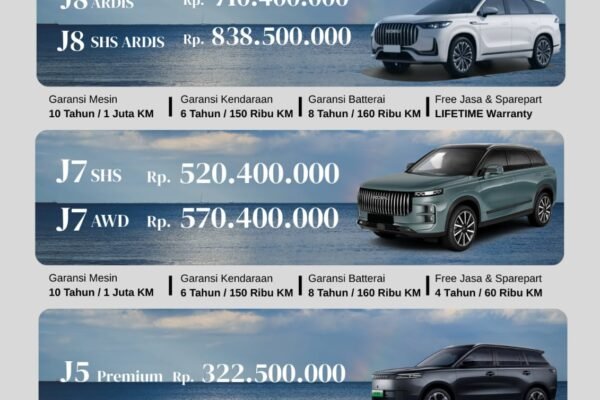 Di tengah era elektrifikasi kendaraan yang berkembang pesat, Jaecoo J5 BEV hadir sebagai salah satu SUV listrik paling menjanjikan yang siap mengubah cara kita memandang mobil masa depan. Mengusung desain yang elegan, teknologi terkini, serta efisiensi energi yang mengesankan, mobil ini dirancang untuk konsumen urban yang tidak hanya peduli pada gaya, tetapi juga pada keberlanjutan lingkungan.